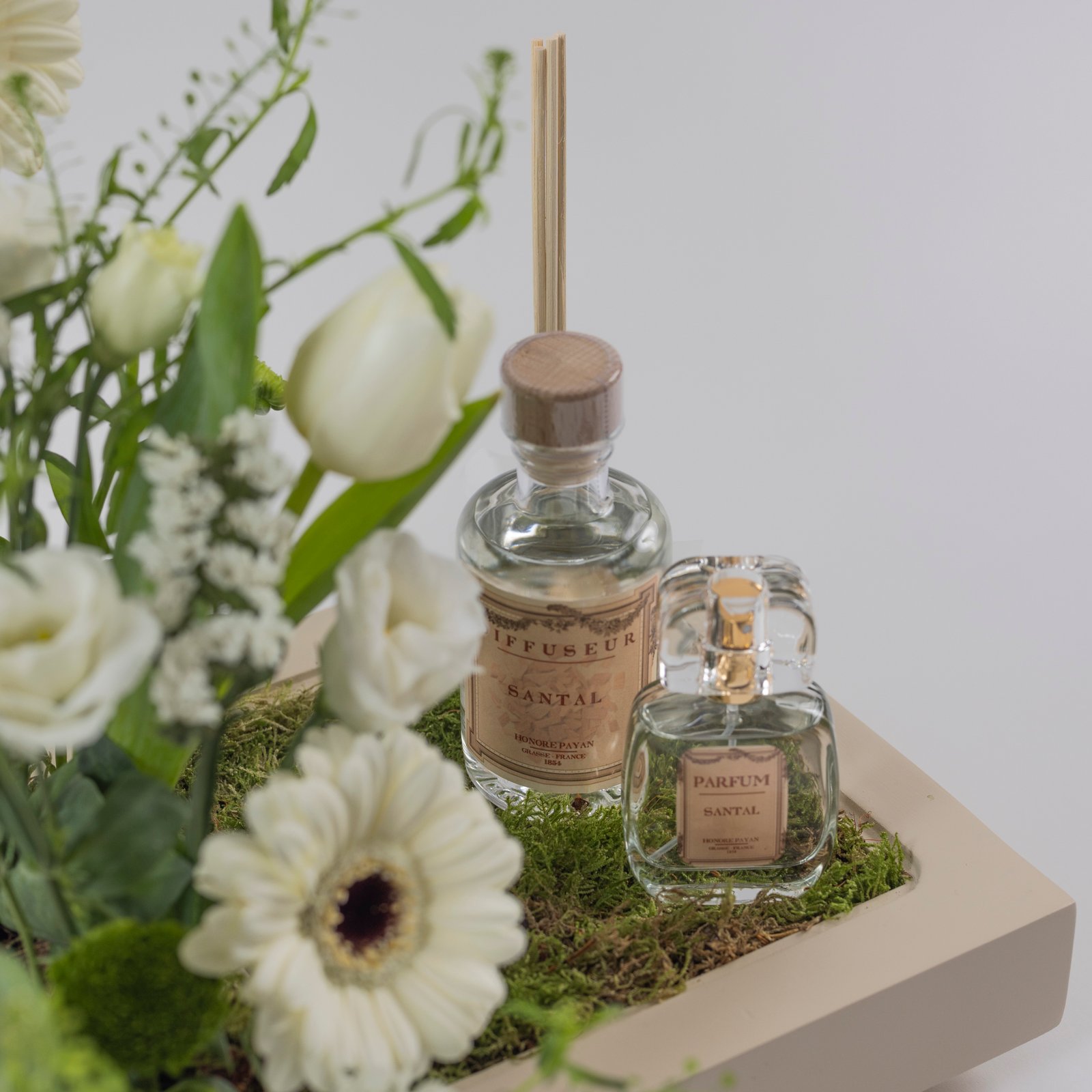 Description Mix of fresh white flowers with 100ml diffusers Sandalwood and 30ml Sandalwood Size: 30cm * 20cm *40cm |
