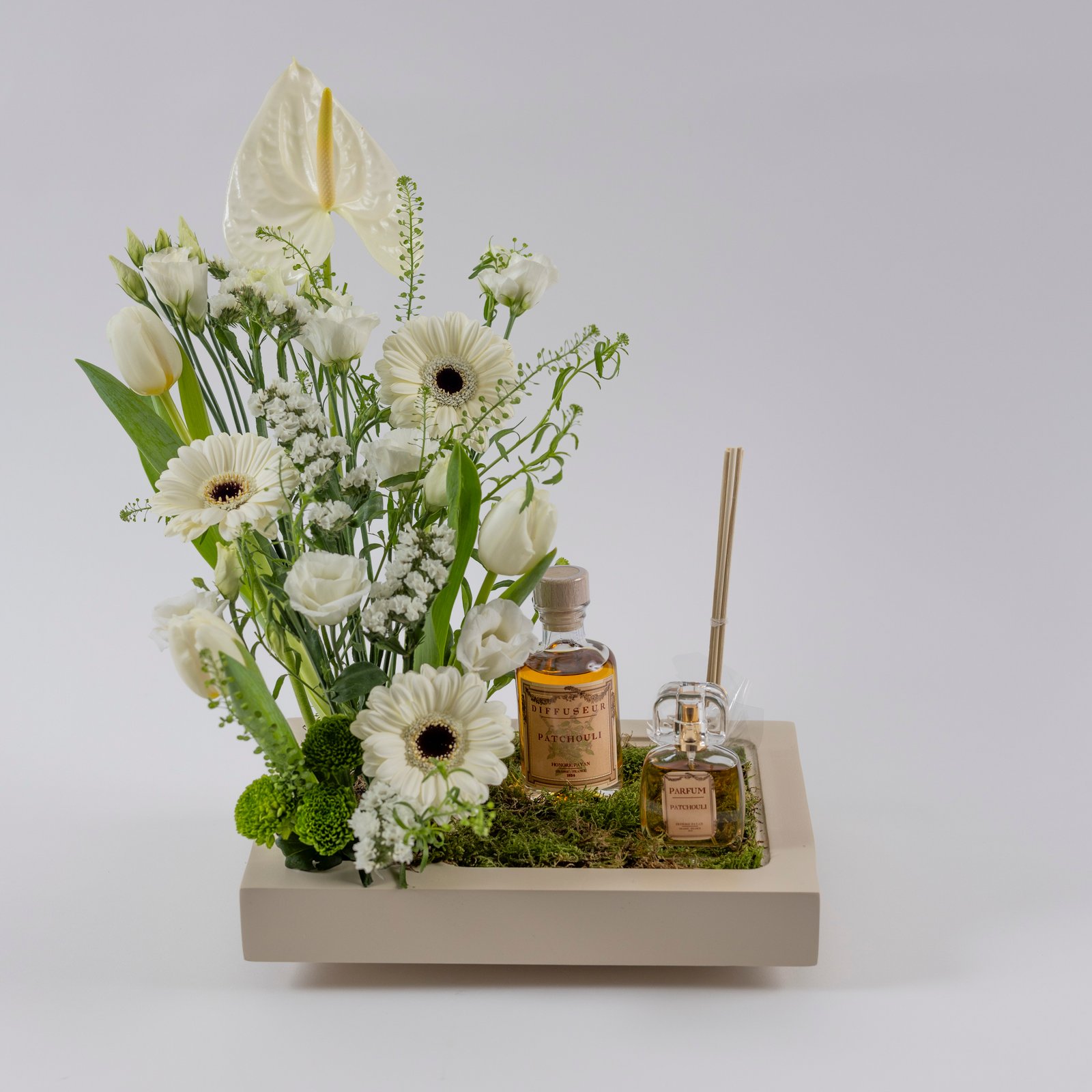 Description Mix of fresh white flowers with 100ml diffusers patchouli and 30ml perfume patchouli and chocolates Size: 30cm * 20cm *40cm |