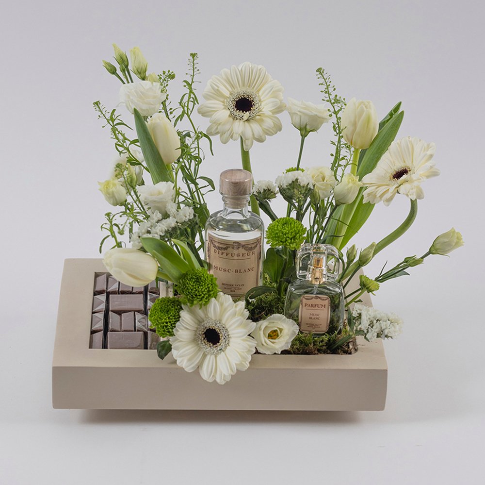 Mix of fresh white flowers paired with 850 grams of Läderach chocolateSize: 50cm*30cm*55cm..