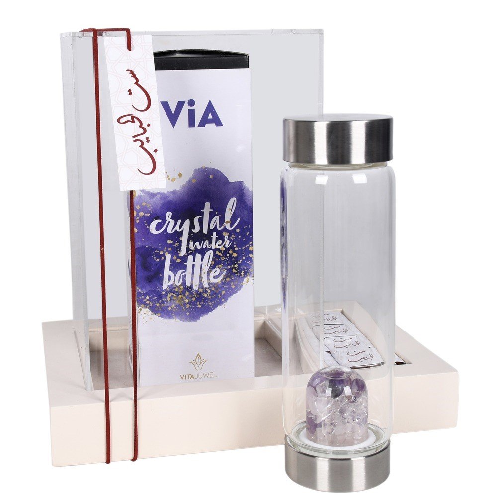 Beige tray with a Vitajuwel Wellness bottle 500ml (Amethyst - Rose Quartz -Clear Quartz) with chocolates individually wrapped
