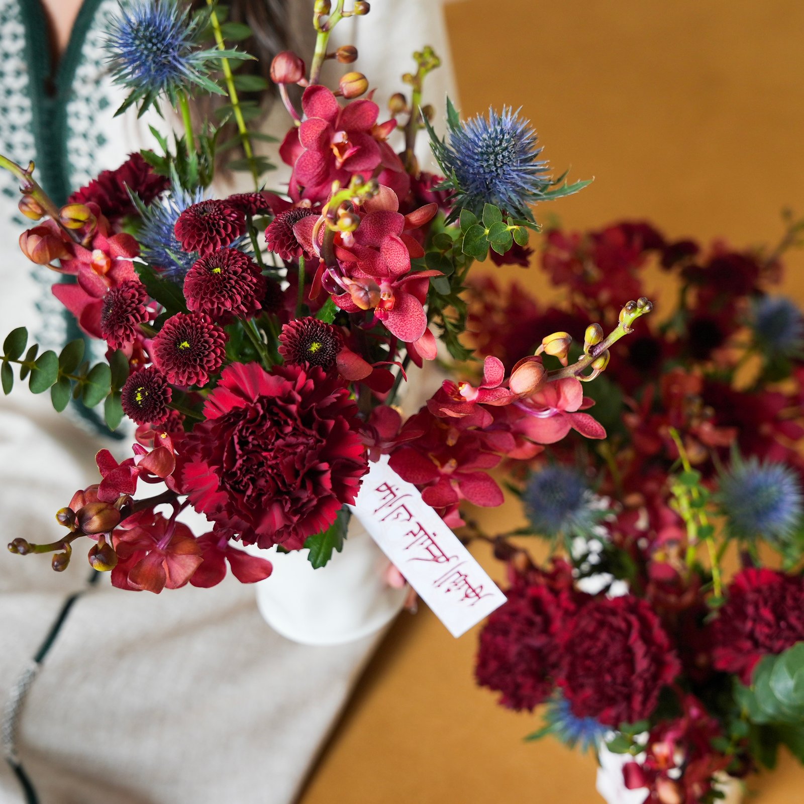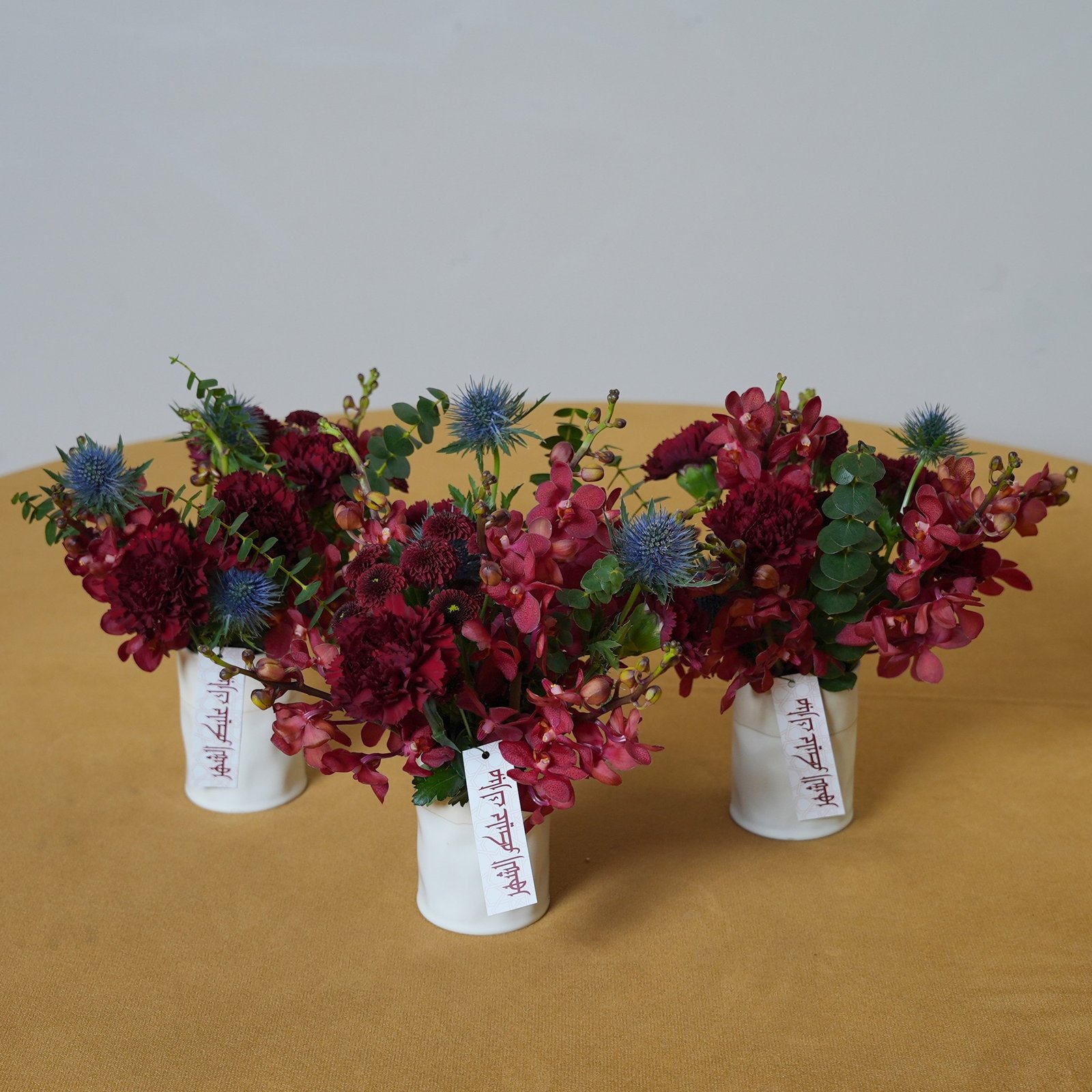 | Description A set of three vases beautifully arranged with flowers and tag مبارك عليكم الشهر |