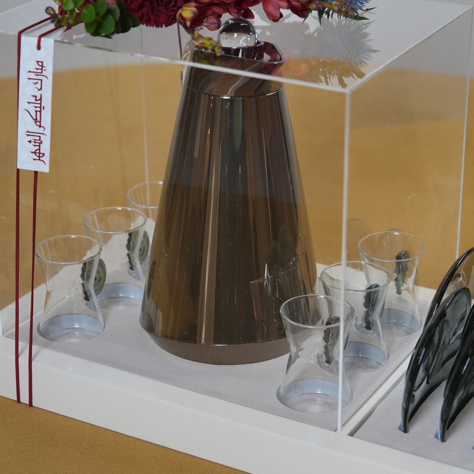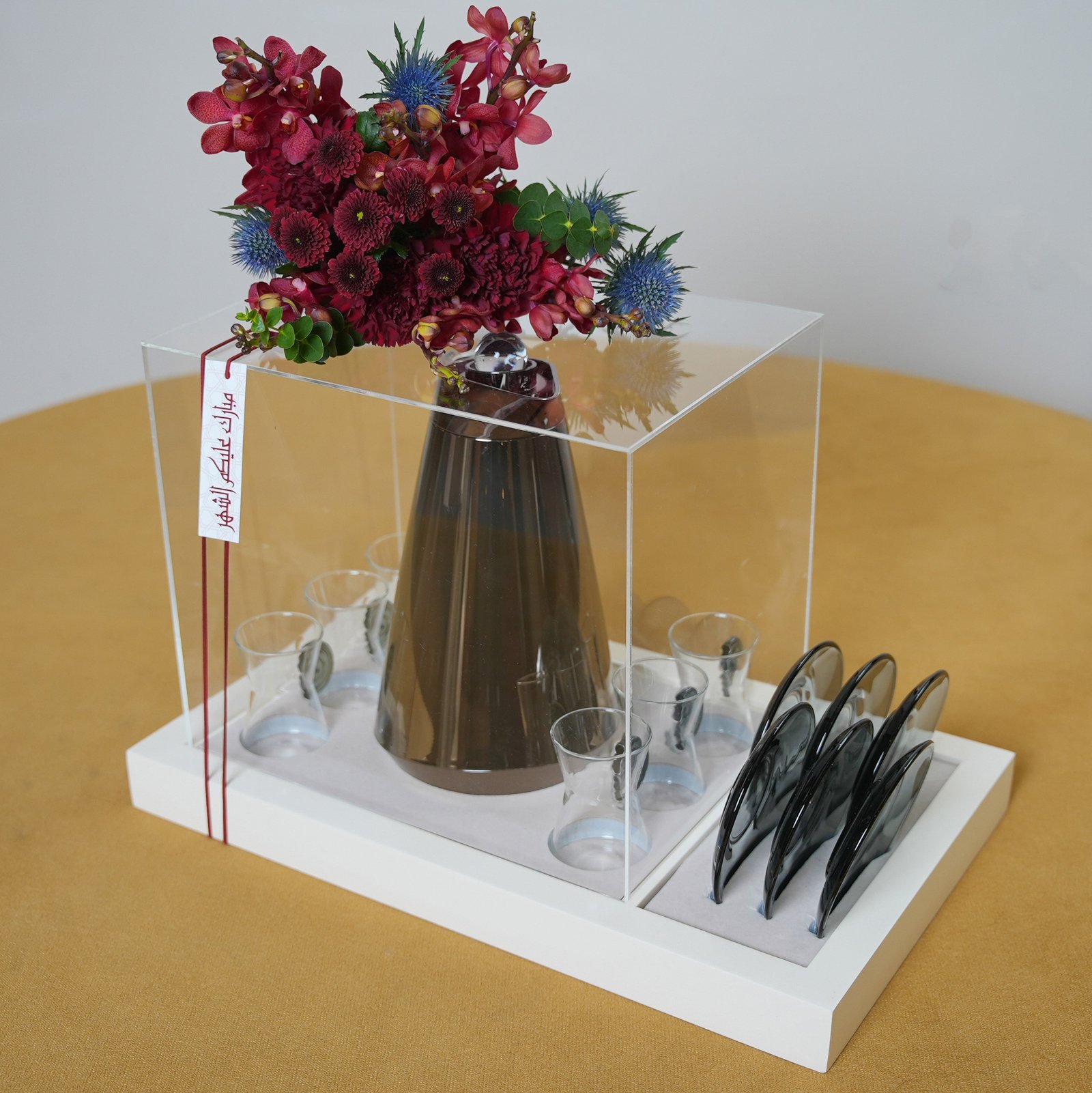 | Description Beige tray with elegant tea set for six and vibrant flowers, with tag مبارك عليكم الشهر |